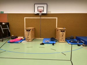 Dann haben wir unsere Schlaf•plätze in der Turn•halle hergerichtet