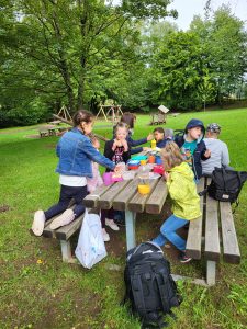 Dort haben sie ihre Schul·tüte aus·ge·packt, Fotos ge·macht und ge·spielt.